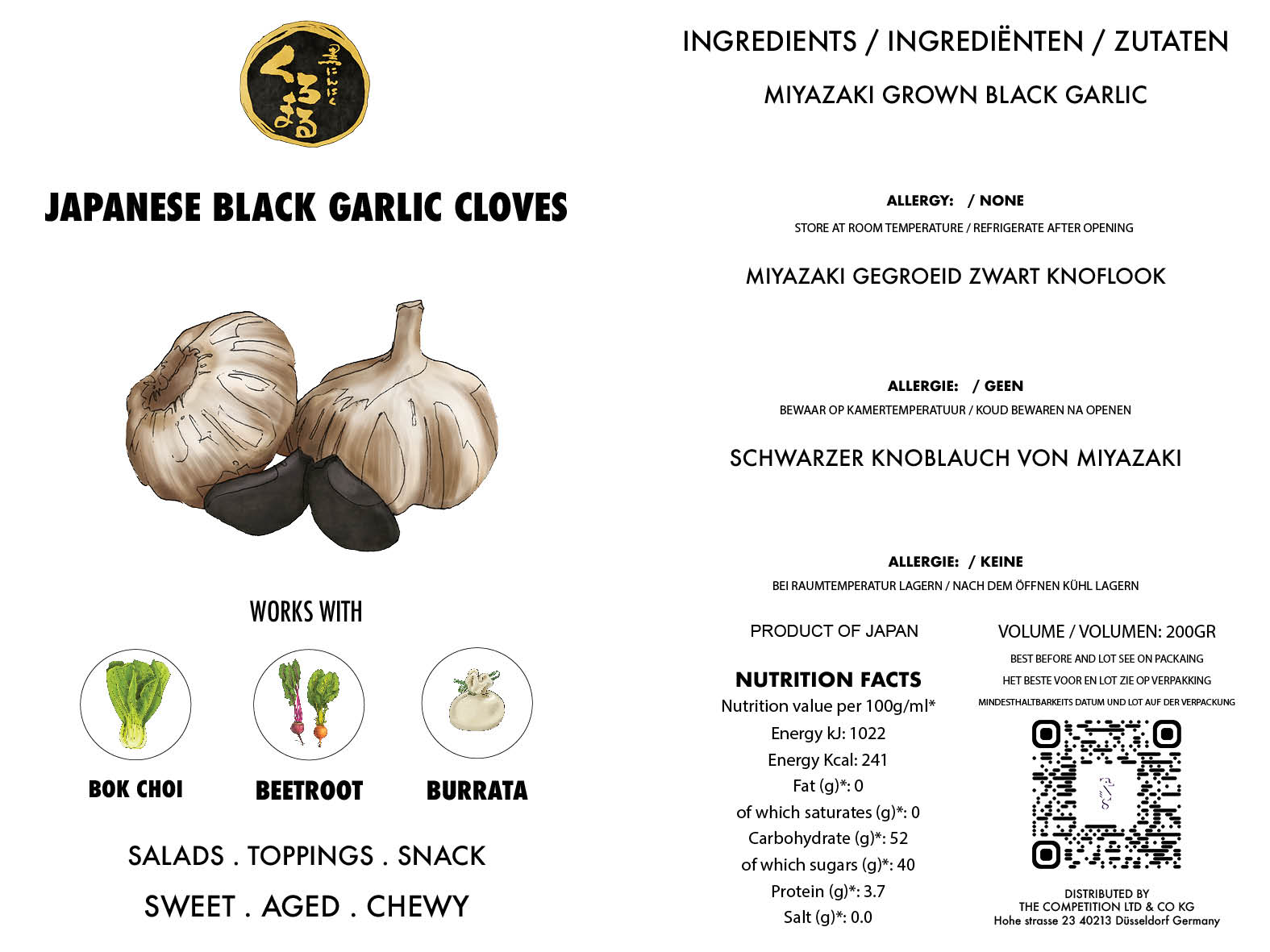 The original black garlic from Momiki, 100% Japanese grown by proud Miyazaki farmers. The Momiki black garlic is slowly dried and aged, resulting in a soft sweet pickle with a flavor profile more akin to an aged balsamic vinegar, rather than garlic itself. Japanese garlic grown in Miyazaki has a unique flavor, which cannot be experienced in Chinese or European garlic.